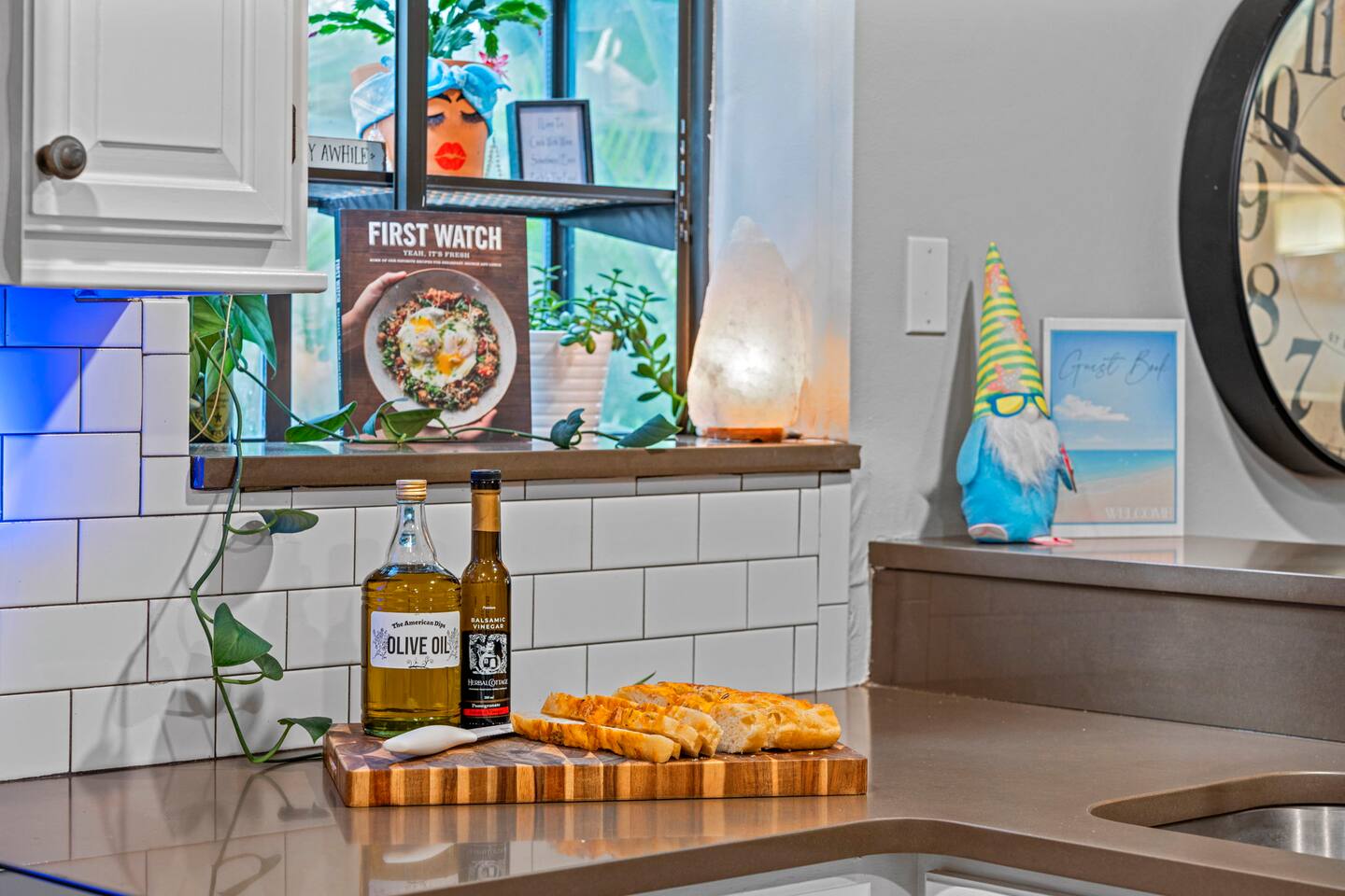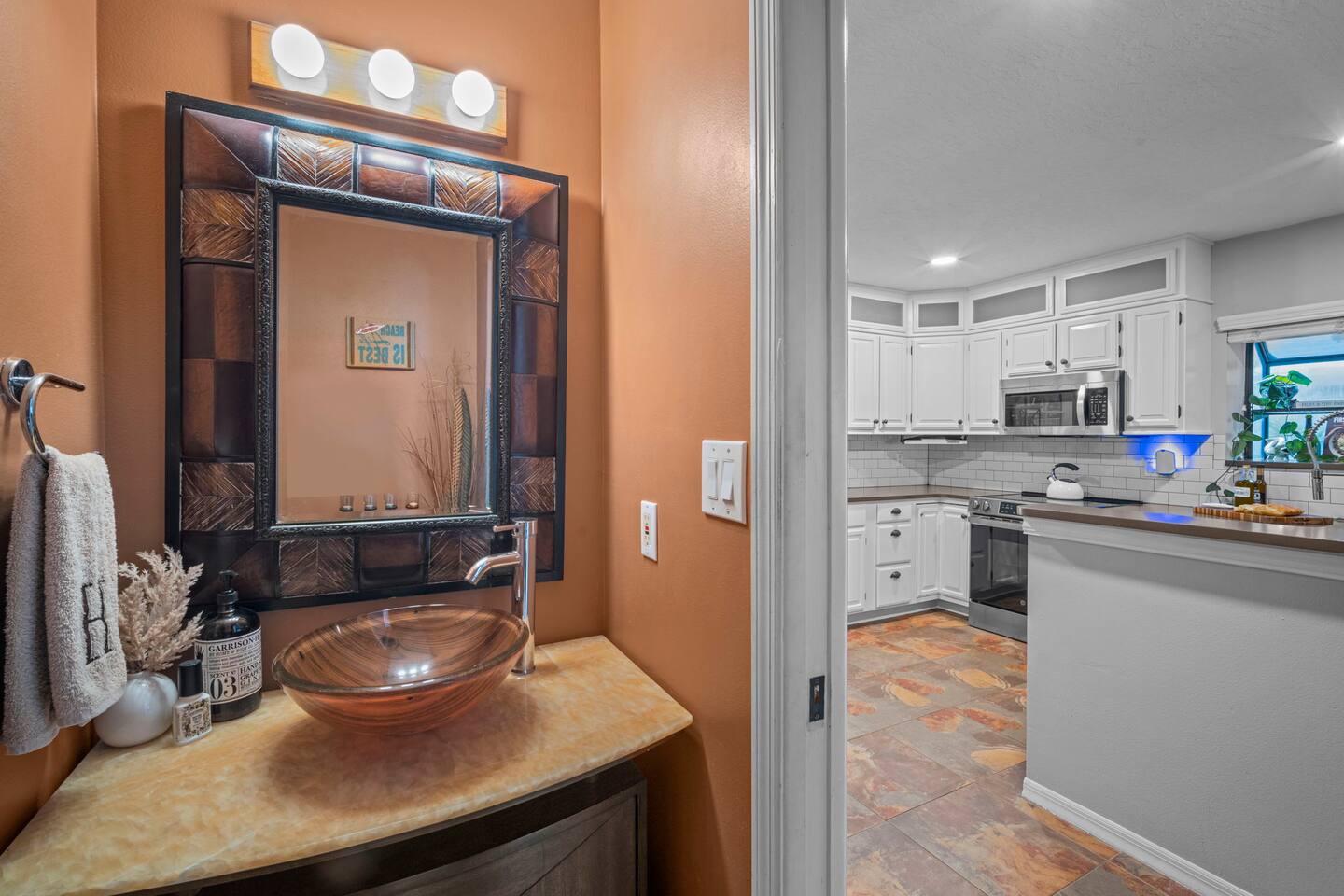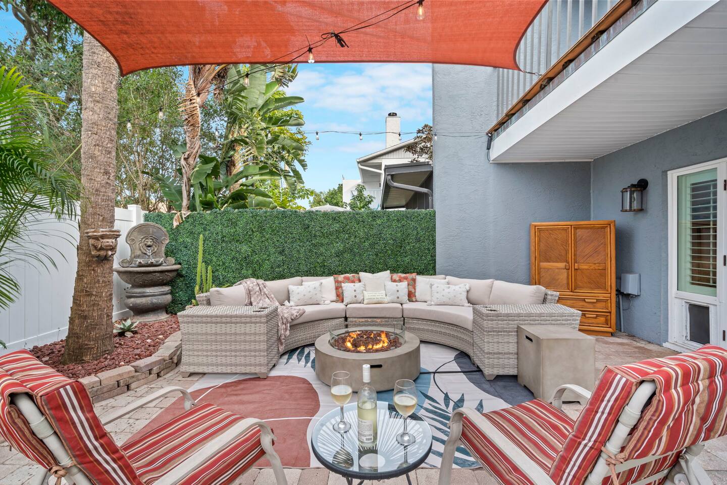 Other details to note: Sharp knives are stored in the cabinet above the lazy Susan. Outdoor lights turn on automatically at dusk and shut off around 10 PM for quiet hours—helpful for late check-ins. Peacocks may be present in the area. Outside security cameras monitor only the parking area for safety. No smoking and no parties, please.