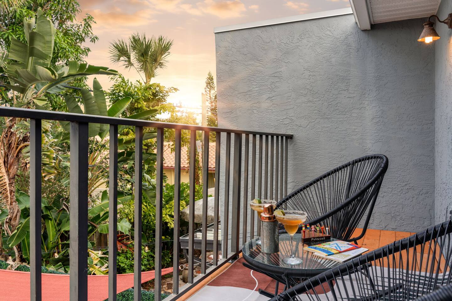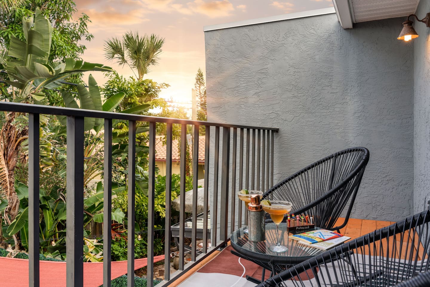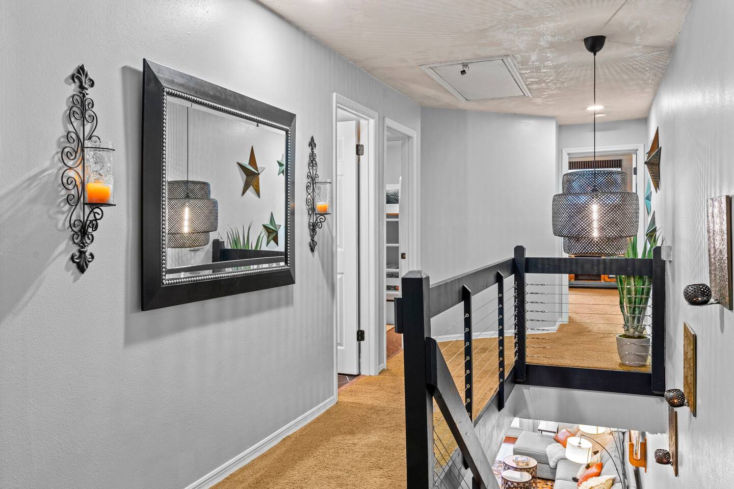Other details to note: Sharp knives are stored in the cabinet above the lazy Susan. Outdoor lights turn on automatically at dusk and shut off around 10 PM for quiet hours—helpful for late check-ins. Peacocks may be present in the area. Outside security cameras monitor only the parking area for safety. No smoking and no parties, please.